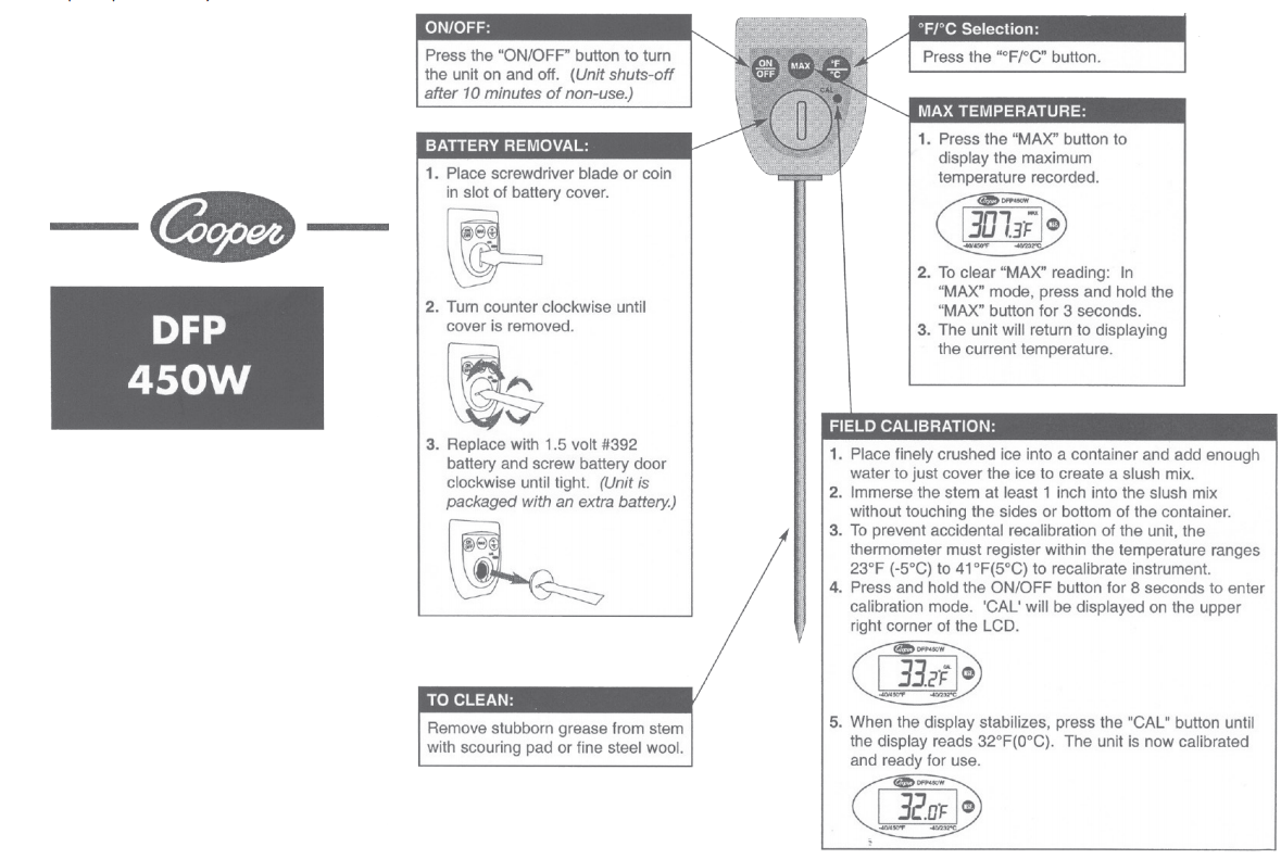 The steps to take to calibrate a digital thermometer are very similar to those described above for a dial type thermometer. The exception is that the digital thermometer may have a reset button that has to be pushed to recalibrate the setting. Cooper model DFP450W requires holding the on/off button for 8 seconds to enter the calibration mode.