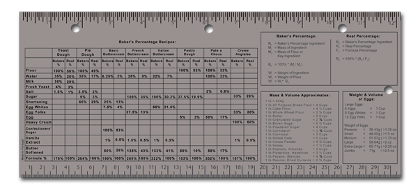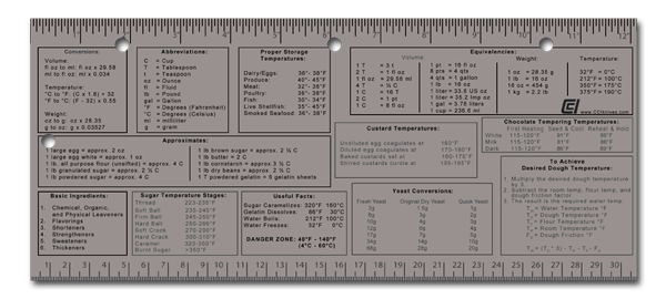 The UBR features useful facts and formulas, common measurements, unit abbreviations, weights, yeast conversions, custard and sugar temperatures, equivalents and much more! This ruler is considered the best on the market by Professional Bakers and Pastry Chefs.