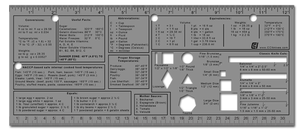 The UCR features precise cutting and modelling guides for: classic vegetable cuts, culinary facts and formulas, common measurements, unit abbreviations, weights, conversions, equivalents, HACCP-based safe cooked food temperatures and much more! This ruler is considered the best on the market by Professional Chefs.